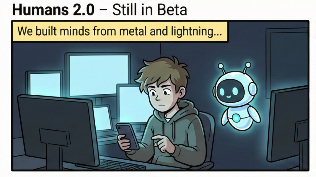 We built minds from metal and lightning,machines that can write, draw, sing,while we forget how to sit stillwithout a glowing screen.